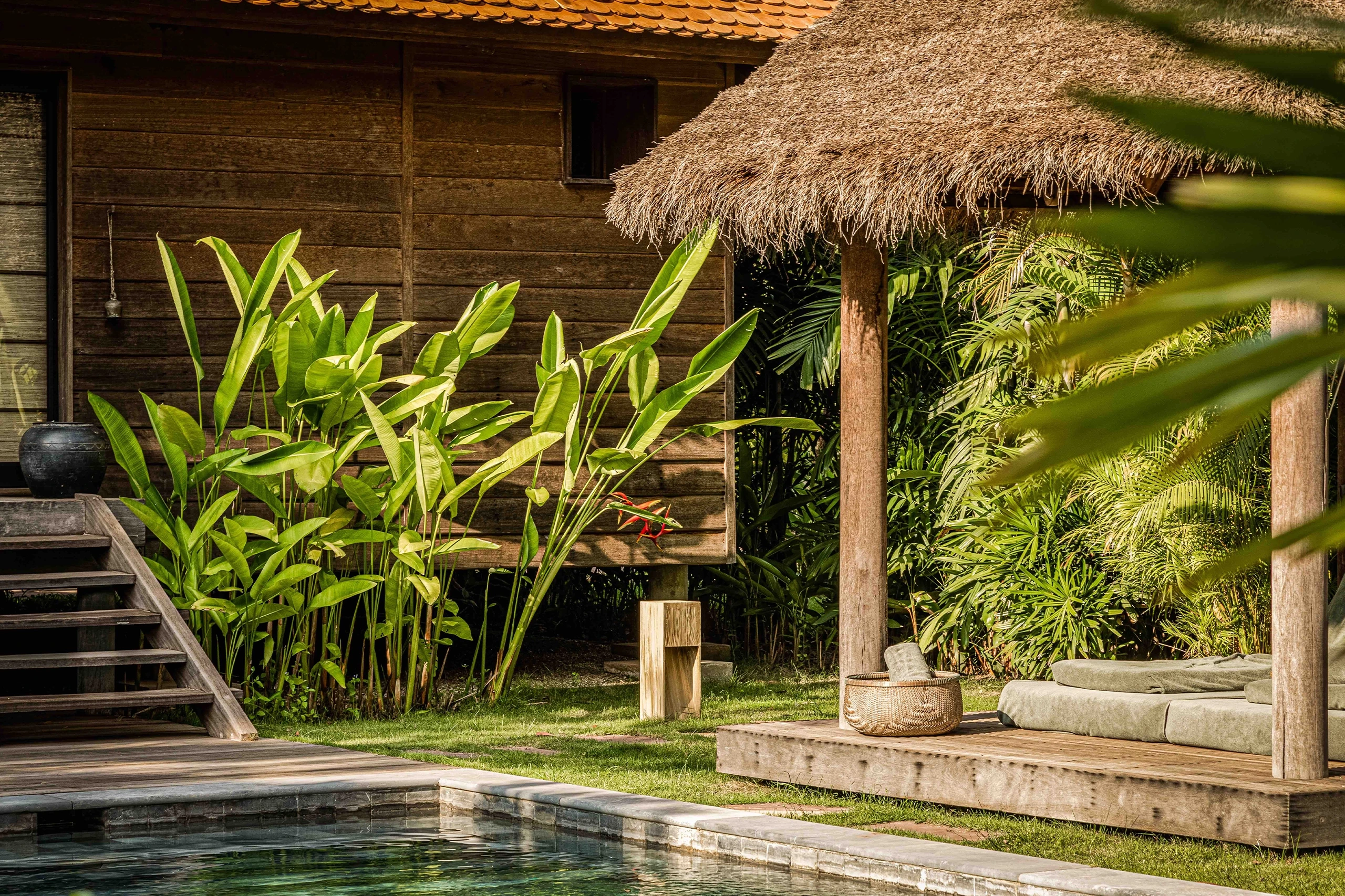 Each with their own 20 sqm plunge pool, our one-bedroom Pool Villas are built on stilts. Outside the private gardens feature sun loungers, thatched-roof Sala with day beds and a dining table.
